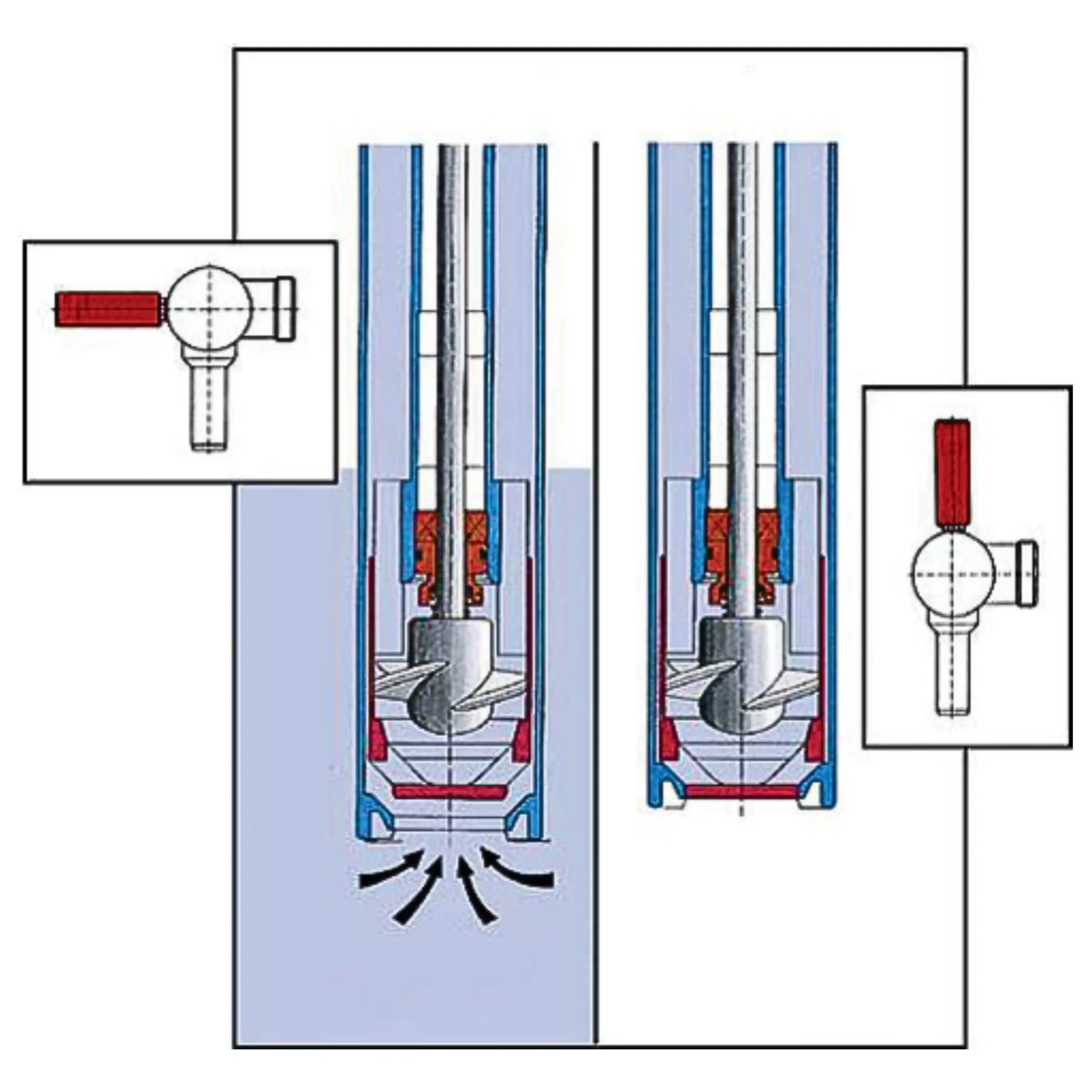 The operating lever opens and closes two pairs of re-circulation ports cut in the side of the pump tube. This re-directs liquid flow between the side discharge port and the mixing ports.