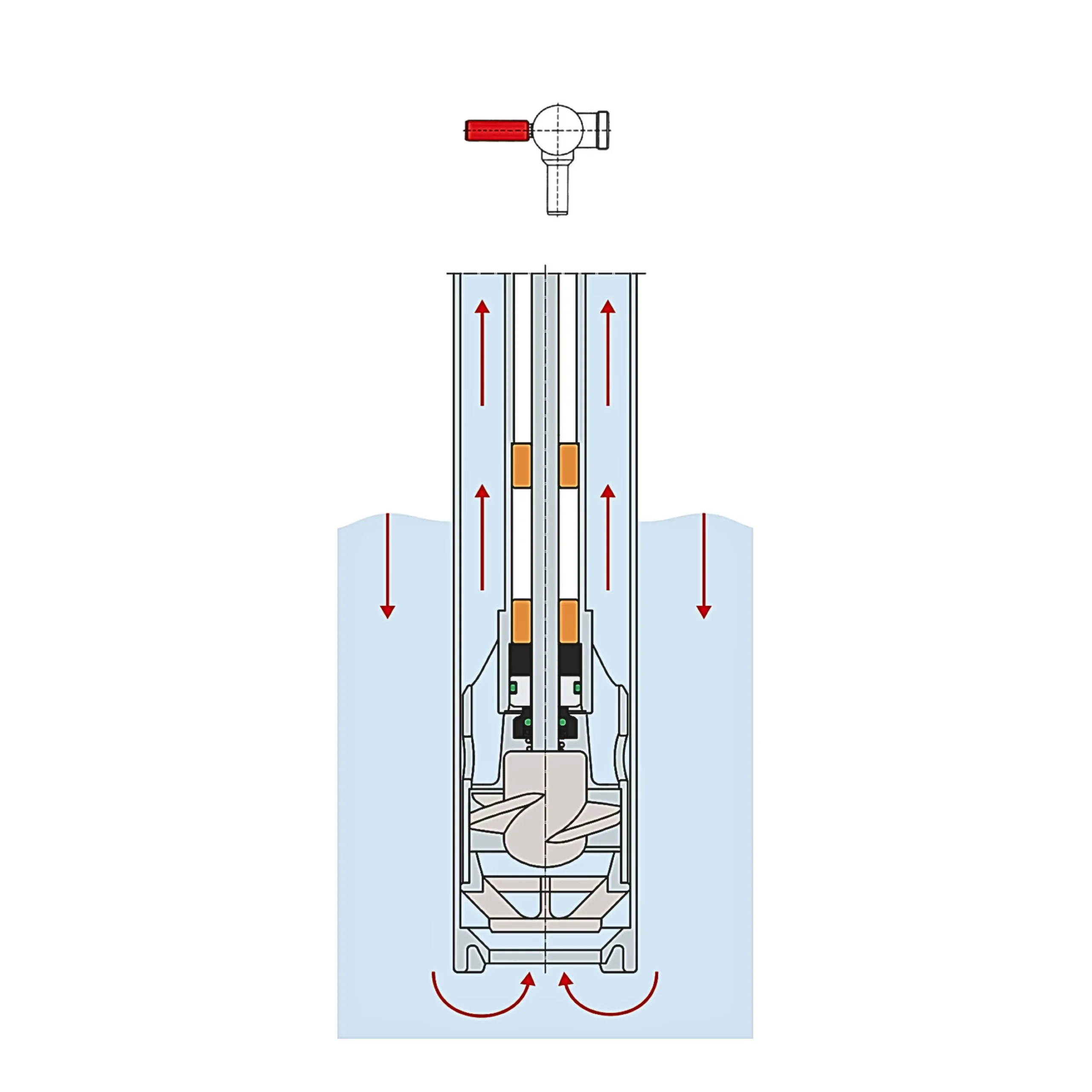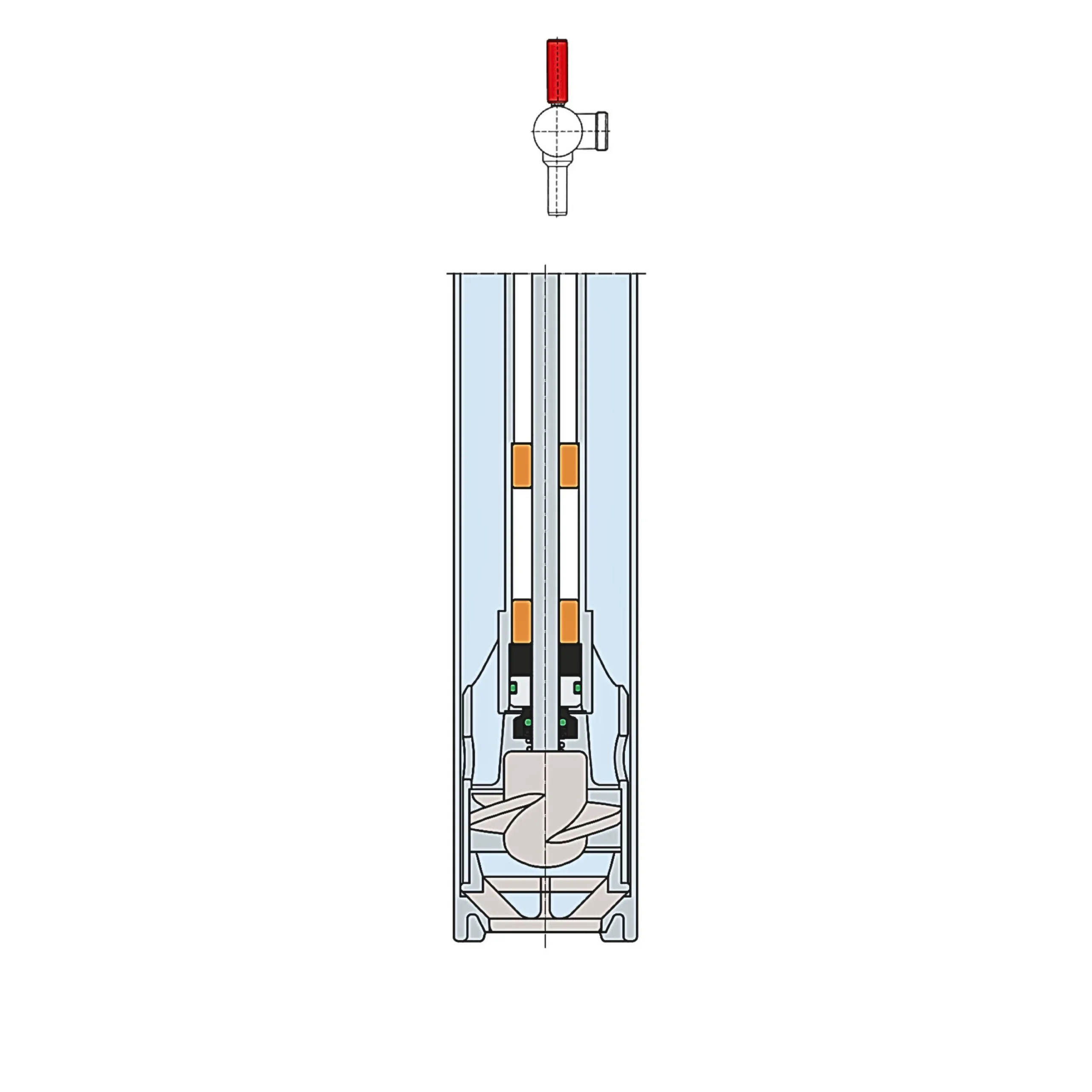 The F 425 incorporates a manual shut-off valve at the pump inlet, below the impeller. The operator opens and closes the valve using the lockable handles at the top of the pump tube.