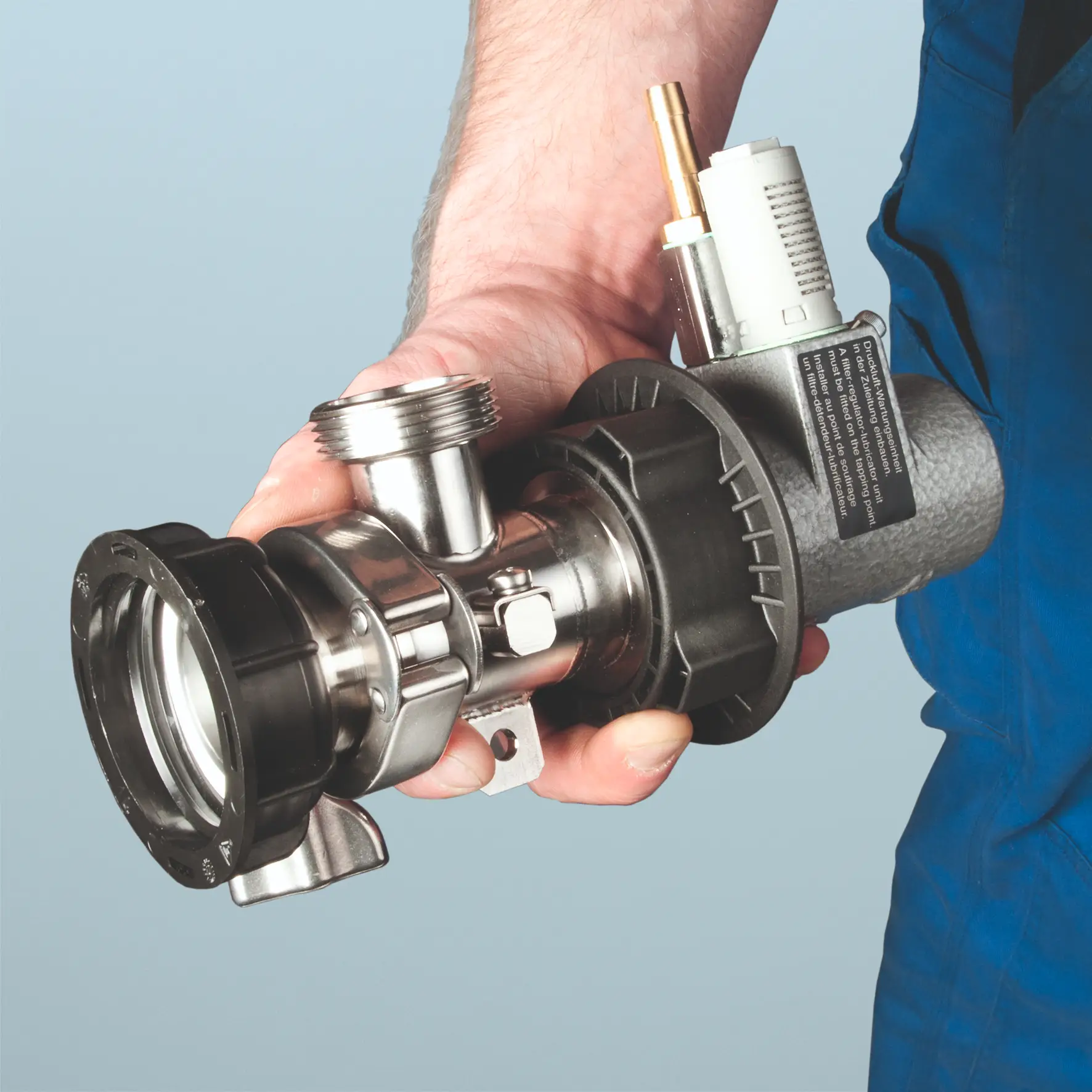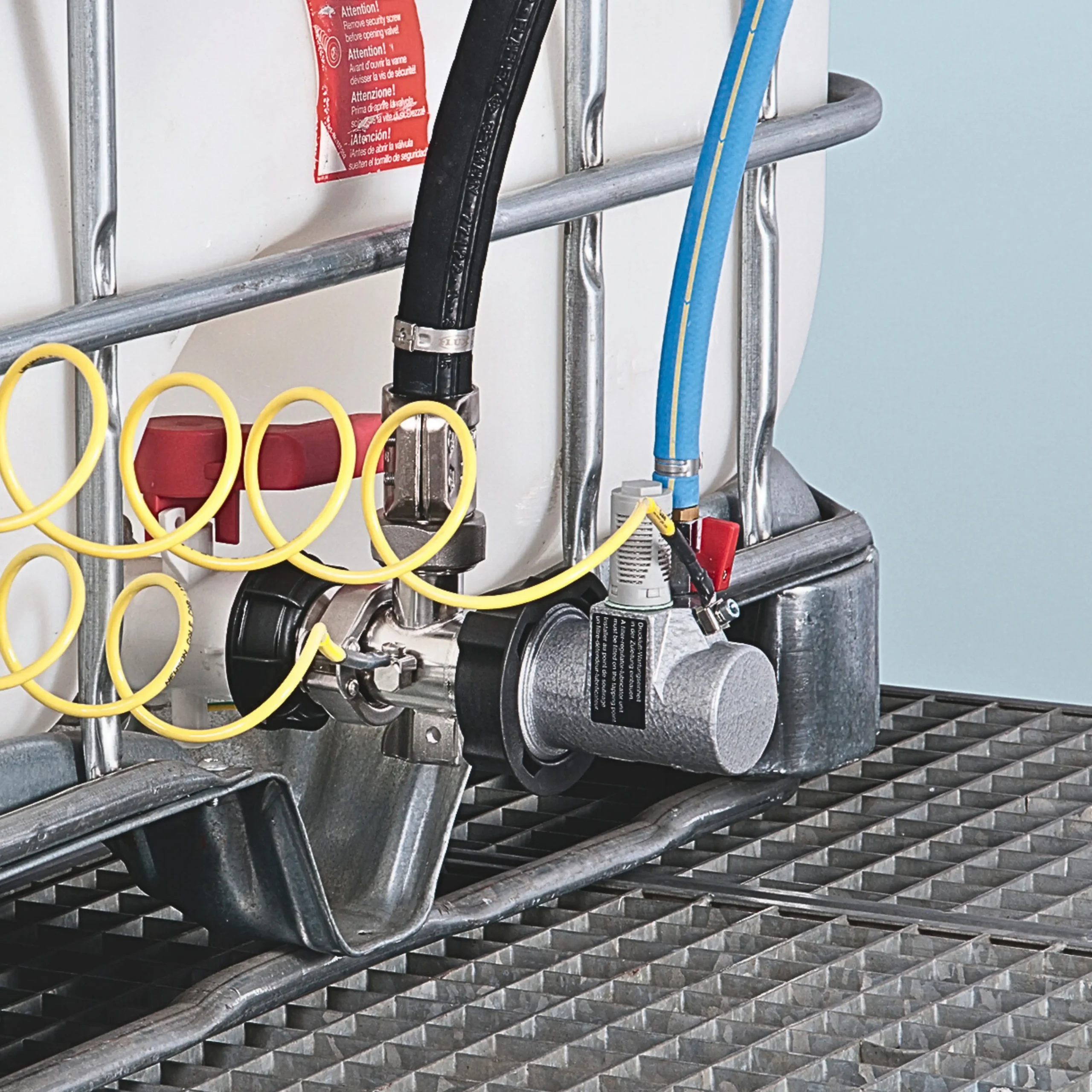 Unlike our conventional pumps that are installed vertically through the top cap of the IBC, the Miniflux instead enables fluid extraction directly from the low level outlet valve. As a result, it offers a clear advantage in height-restricted areas, or when using stacked IBCs.